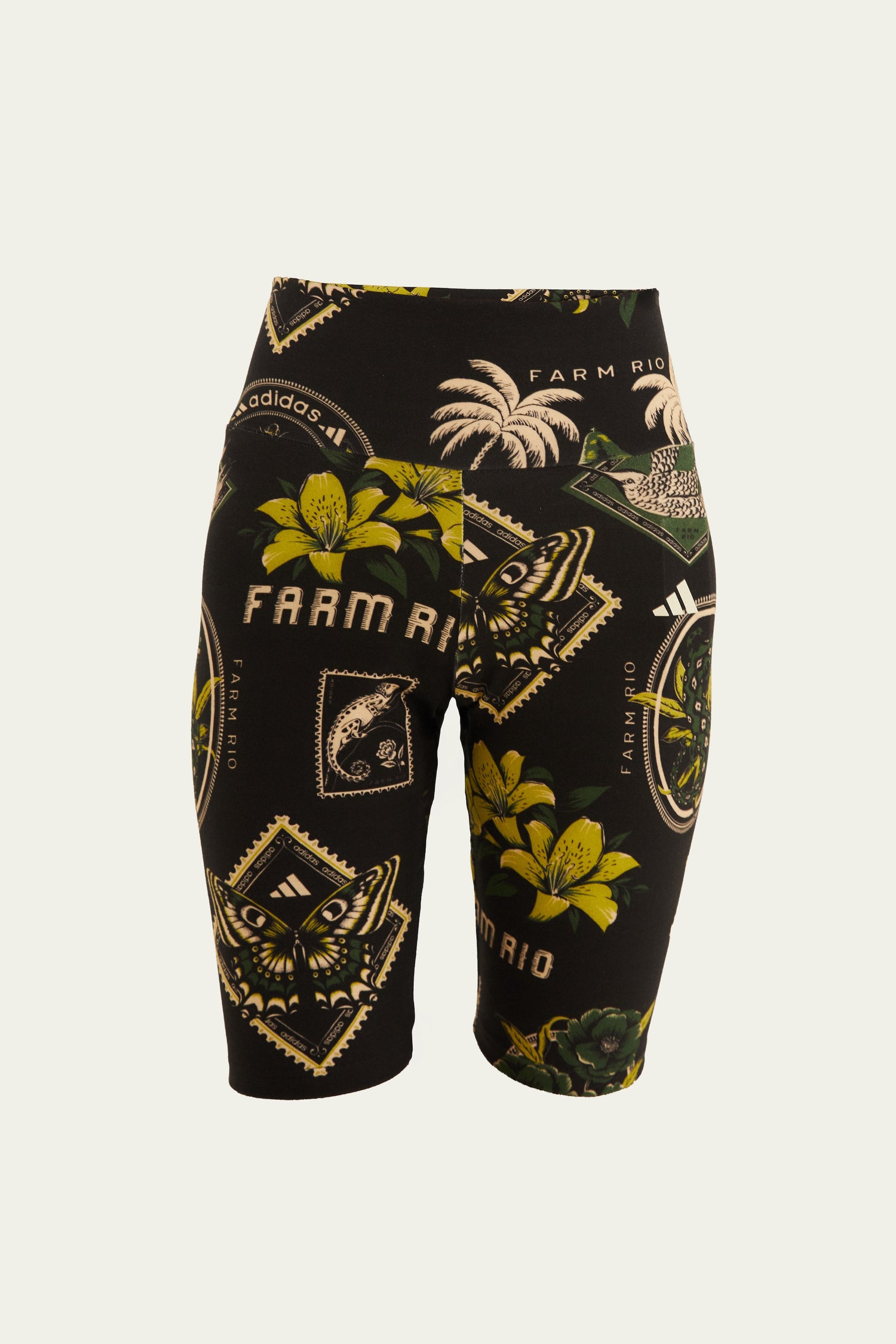 The Label Garden Black Adidas Bike Short fuses sporty allure with FARM Rio’s vibrant spirit. Crafted with a sleek, form-fitting silhouette, these black shorts bloom with bold florals, butterflies, and stamp motifs in soothing shades of green and cream. The high-rise waist enhances comfort and movement, making it a playful yet graceful statement for active days or casual charm. This piece beautifully celebrates nature’s intricate details with a contemporary edge.