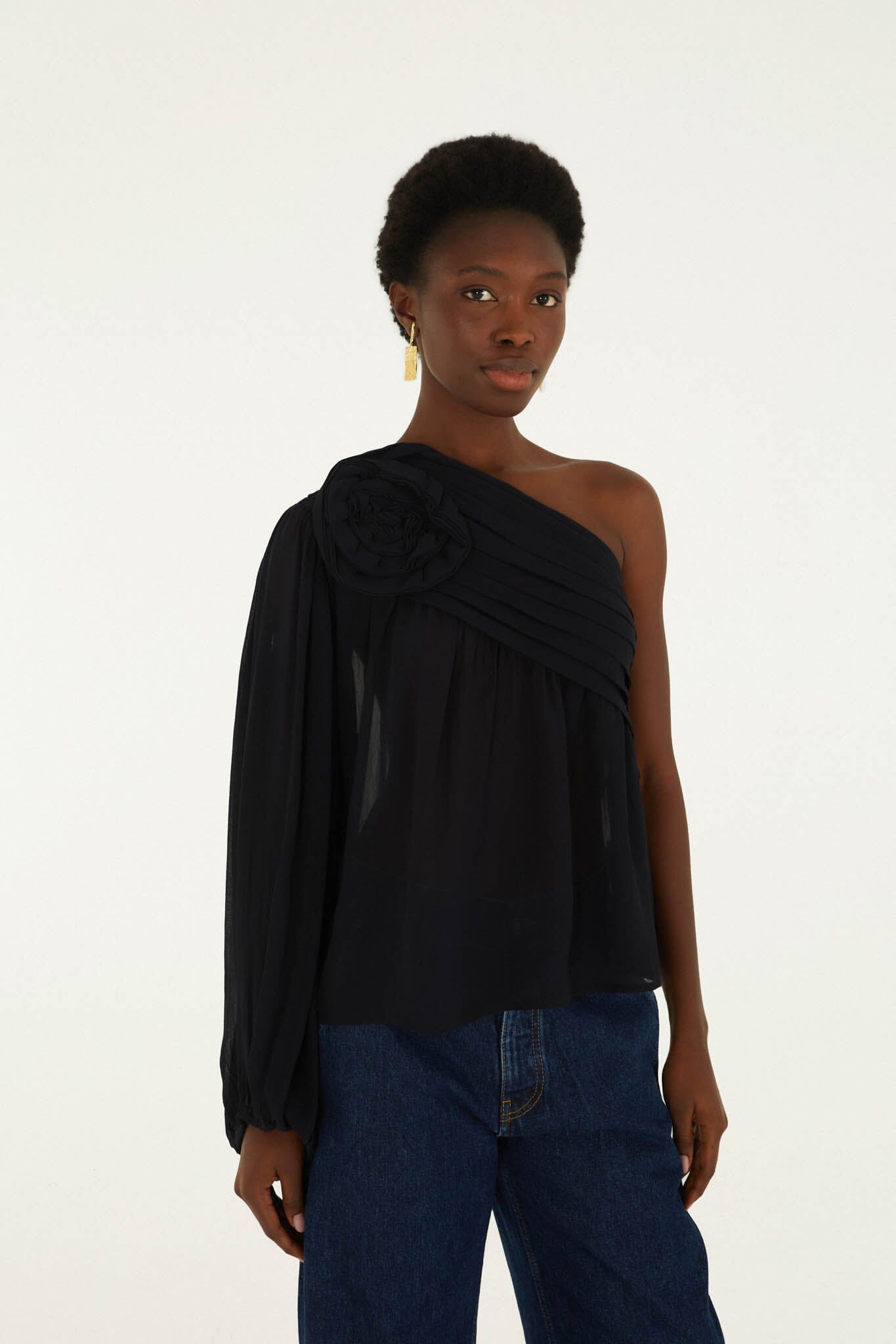 Burgundy 3d Flower Draped Long Sleeve Blouse