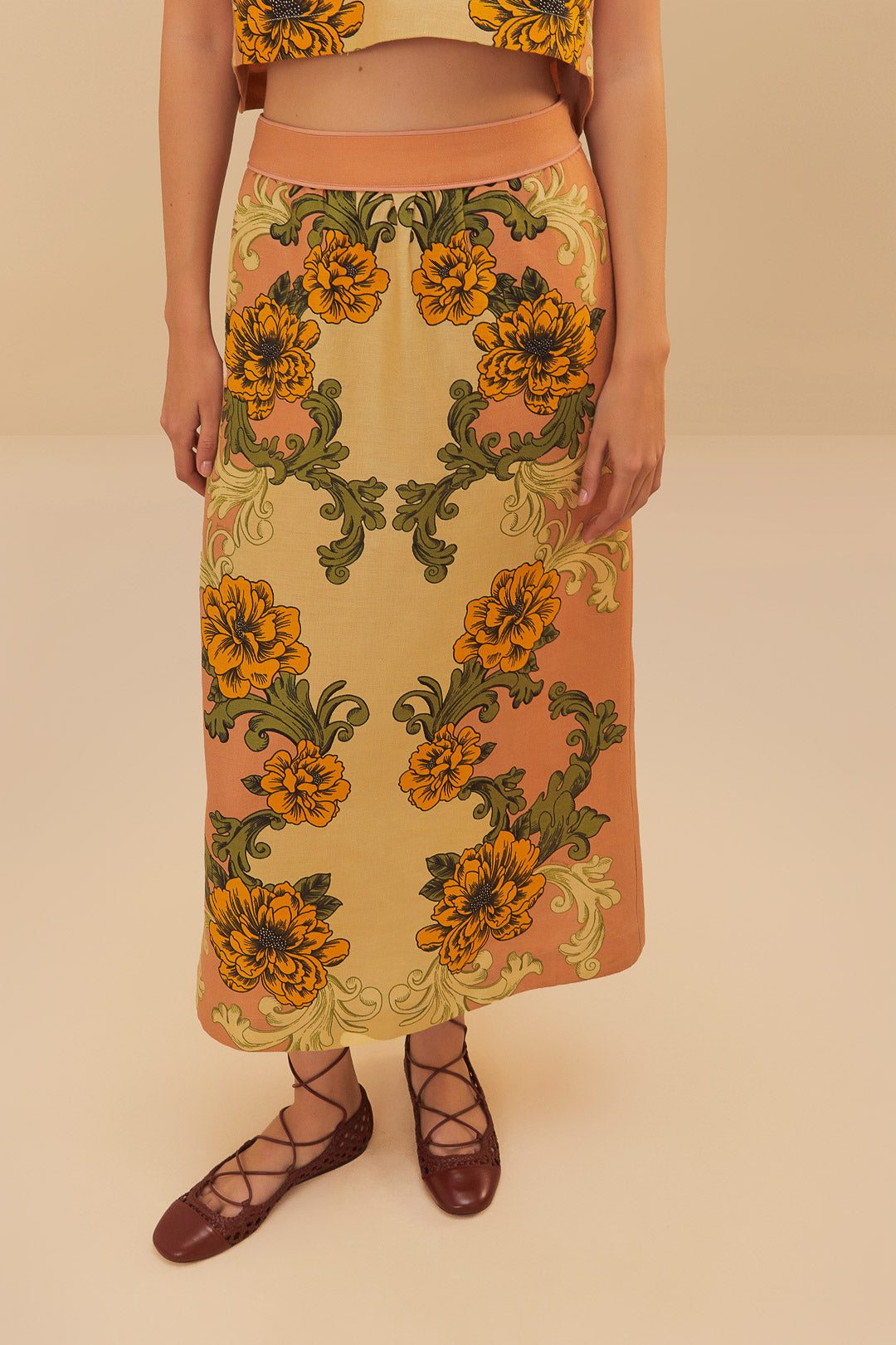 Step into a garden of dreams with our Pink Delicate Flower Arabesques Euroflax™ Premium Linen Midi Skirt. This charming piece features whimsical floral patterns that dance across a canvas of soft pink linen, infused with subtle arabesque designs. The graceful silhouette flows effortlessly, offering a playful sway with every step. Made from responsible materials, this skirt beautifully blends elegance with a touch of bohemian flair.