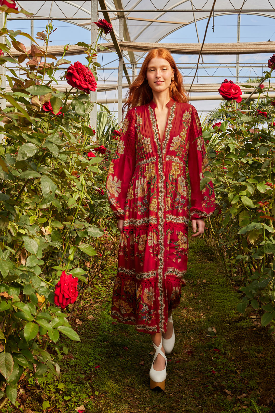 Embrace the vibrant spirit of nature with the Red Garden Delight Long Sleeve Midi Dress by FARM Rio. This enchanting piece features a mesmerizing blend of colorful florals that dance across a backdrop of rich red hues. The fluid silhouette, enhanced by a playful V neckline, exudes effortless charm, while the gentle flow of the long sleeves ensures an elegant and captivating look. Perfect for adding a touch of joyous elegance to any occasion.