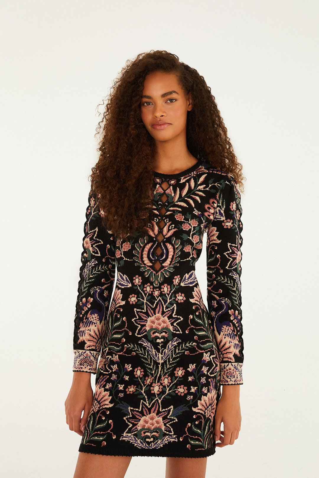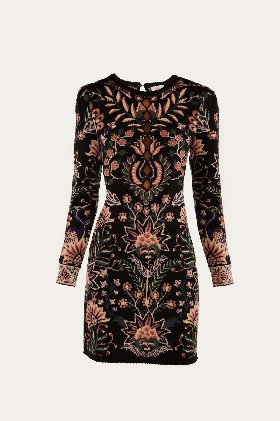 The Marvelous Garden Knit Dress from FARM Rio blooms with intricate floral patterns in soft pinks, greens, and purples against a deep black background. Its round neckline frames a delicate lattice cut-out detail that adds a playful allure, while the long sleeves complement its elegant, body-skimming silhouette. This knitwear piece invites a cozy embrace with a spirited charm that celebrates nature’s vibrant beauty and effortless feminine grace.