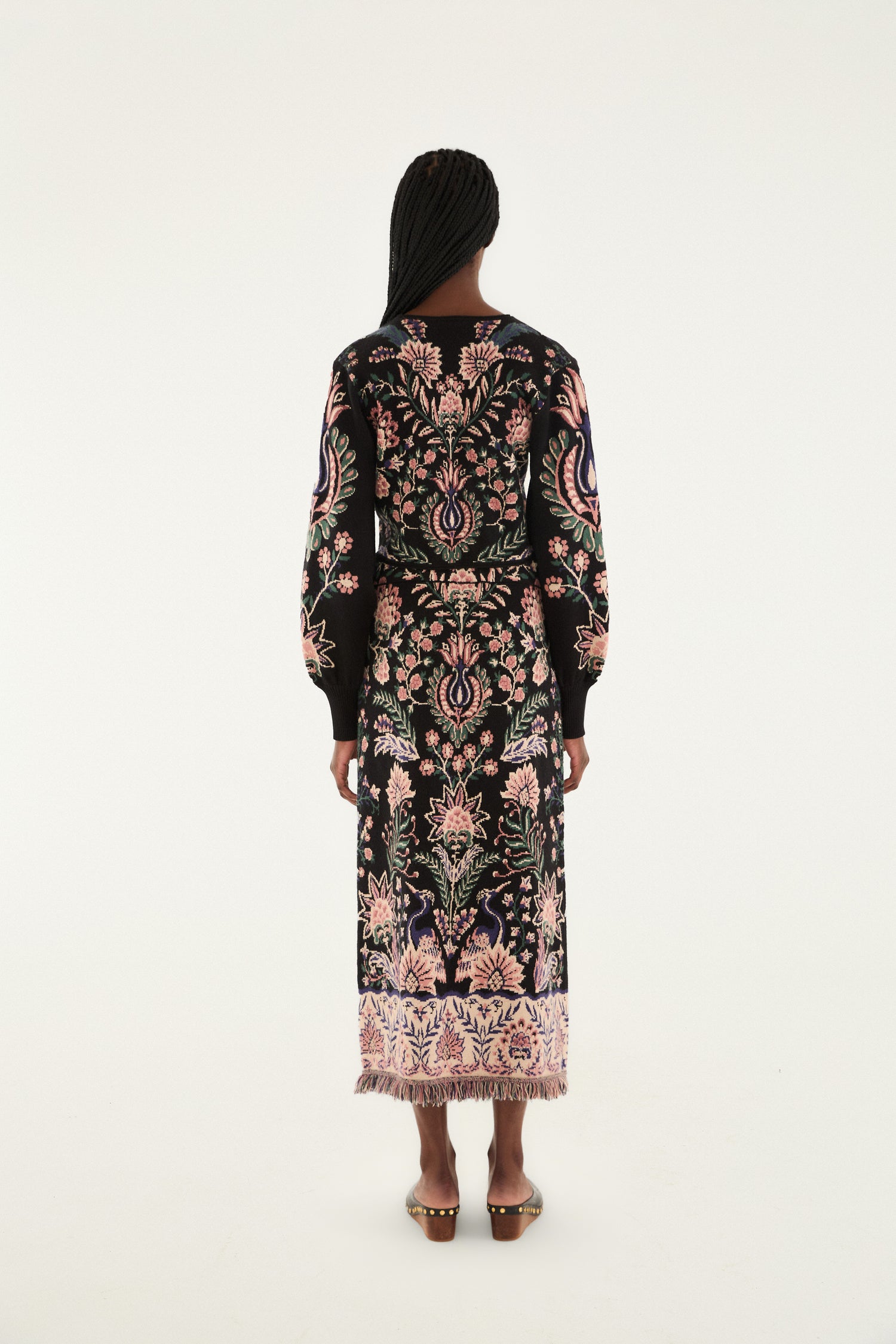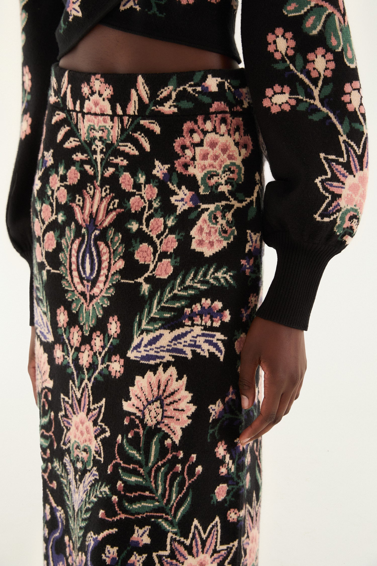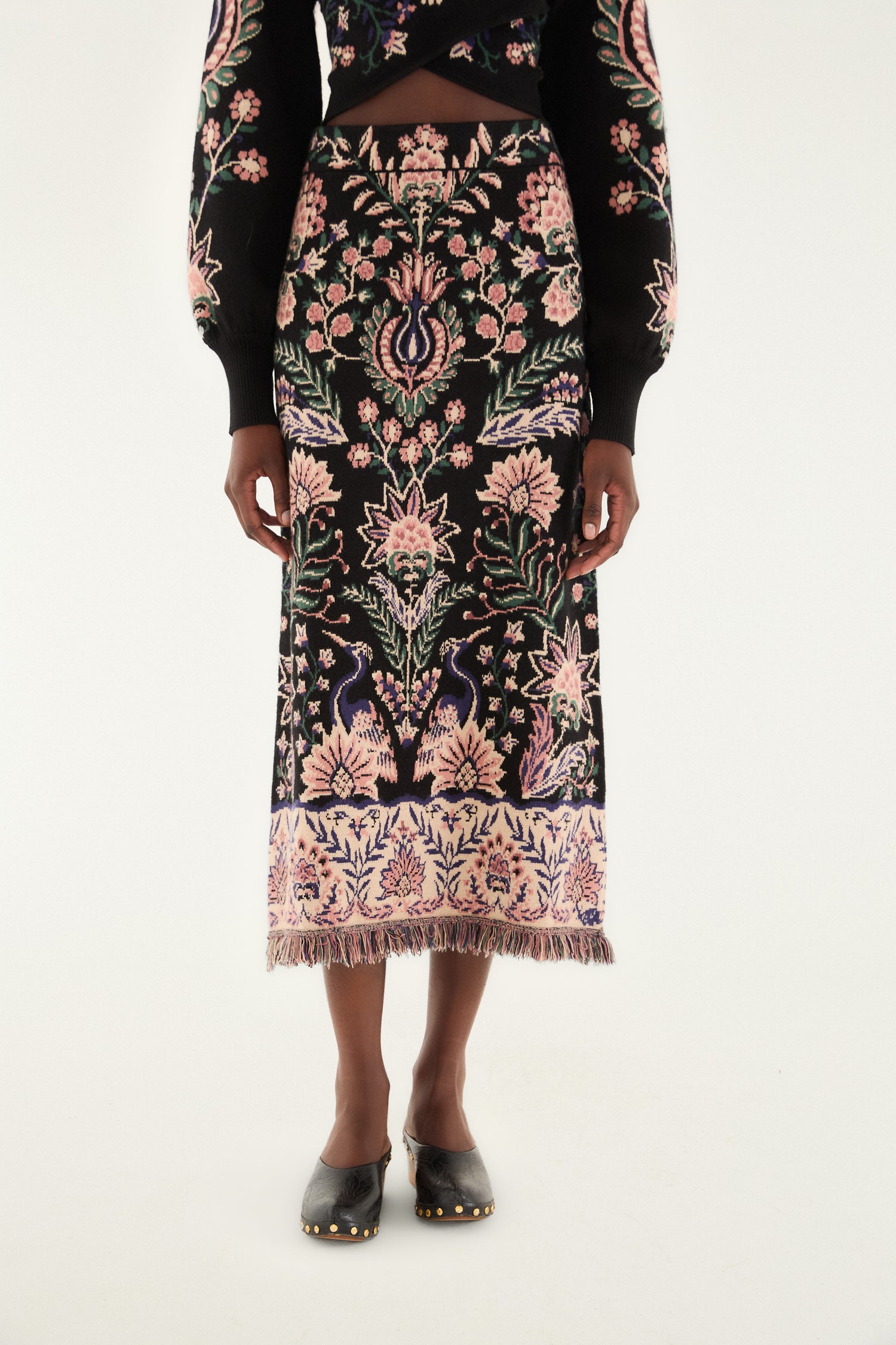 The Marvelous Garden Knit Skirt by FARM Rio blooms with intricate floral and fauna patterns in soft pinks, greens, and purples against a rich black backdrop. Its graceful midi silhouette flows effortlessly, ending with a playful fringe hem that adds texture and charm. Crafted in cozy knitwear, this skirt weaves warmth with artistry, inviting a touch of nature’s magic into your wardrobe with every step.